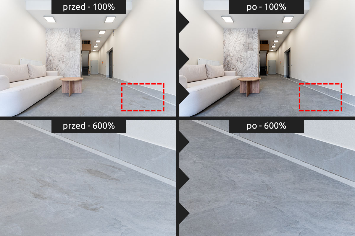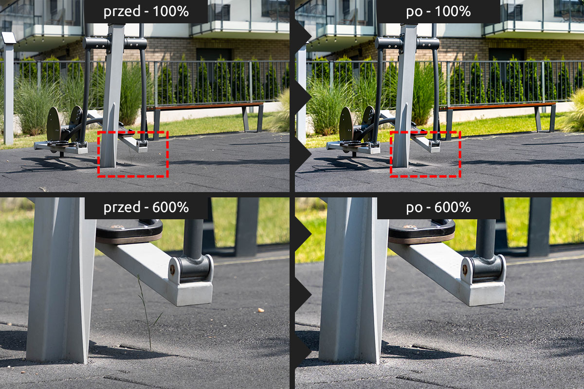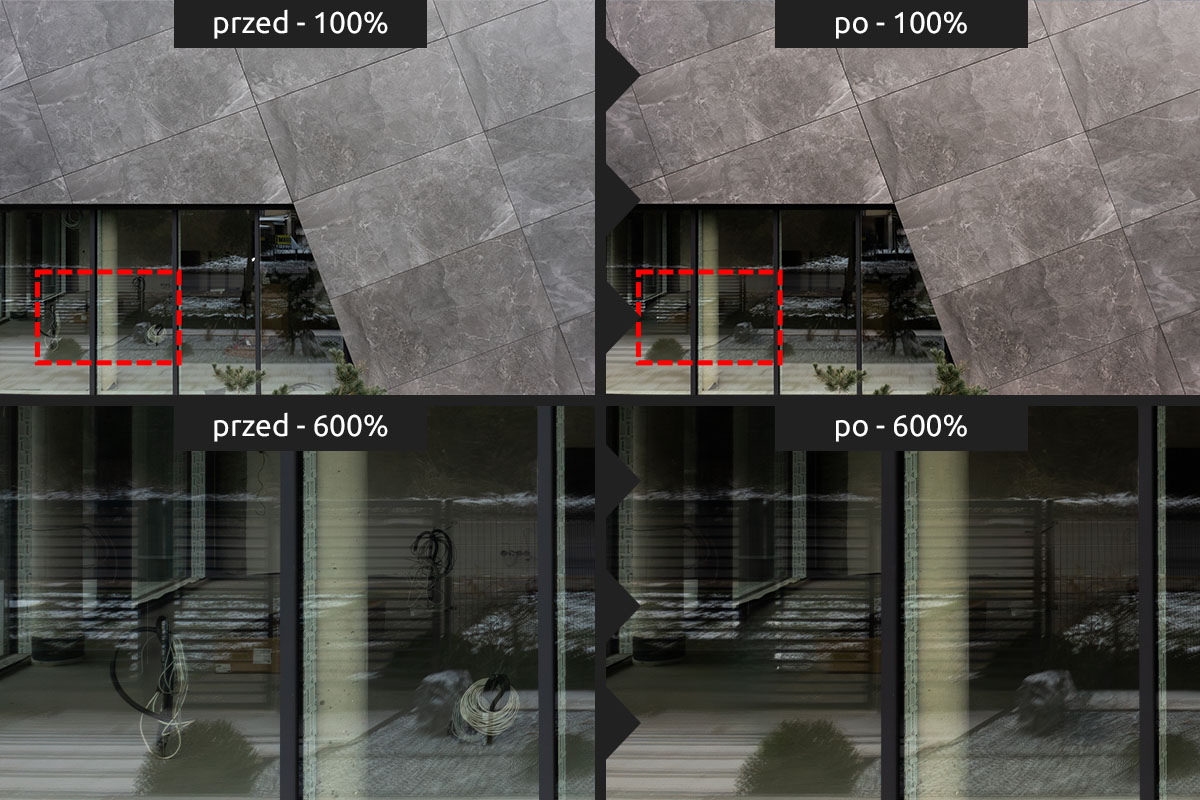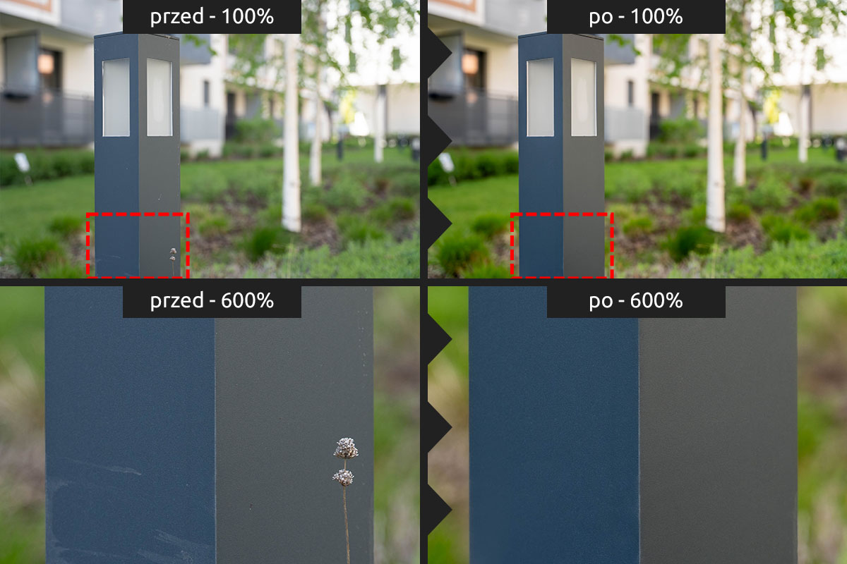 Usuwanie niechcianych elementów Gdy na zdjęciach Twojej firmy, jej produktów lub realizacji pojawiły się przypadkowe osoby, logotypy czy elementy zakazane do publikacji – czyścimy kadr pod kątem prawnym i estetycznym.